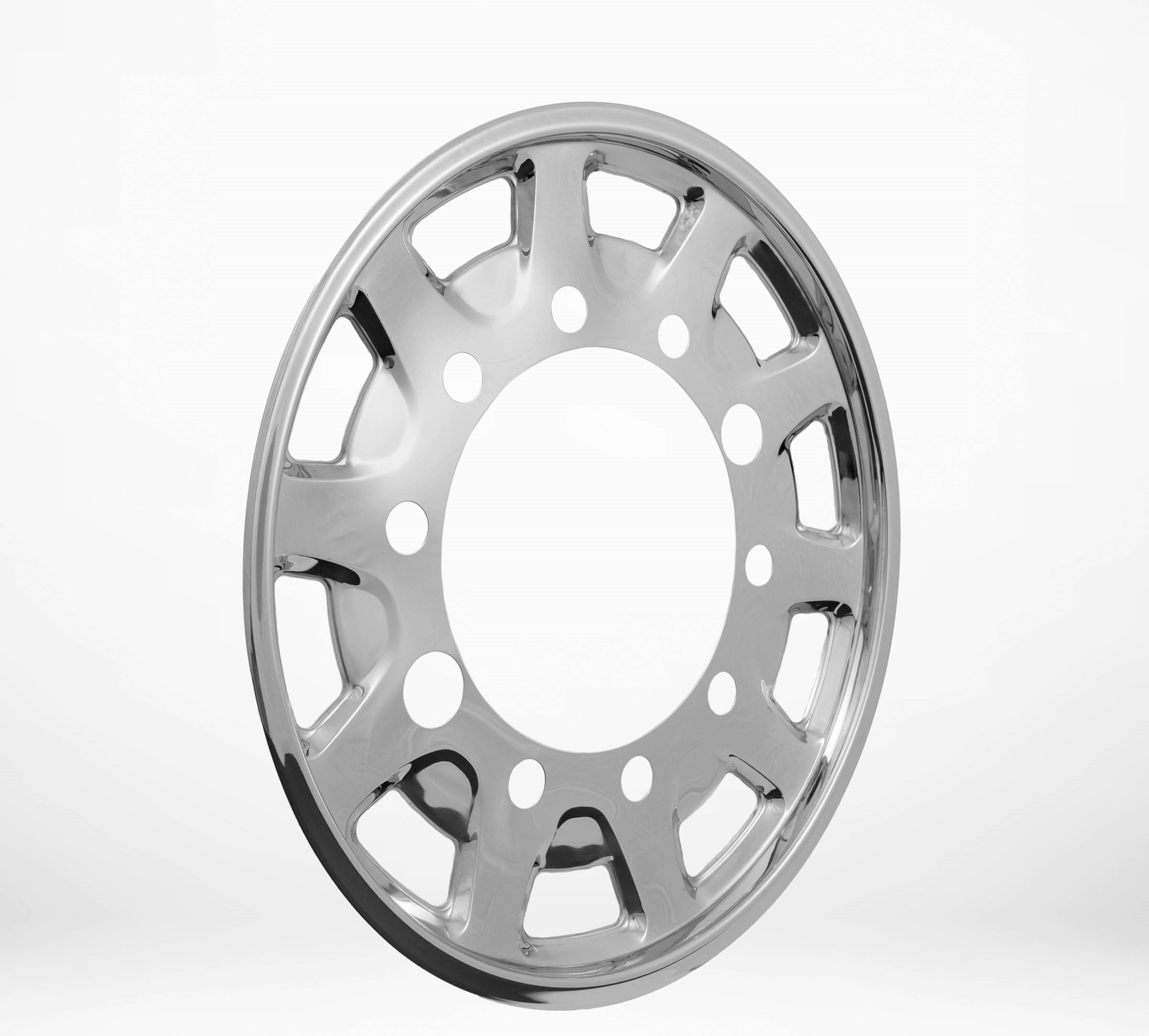 A pair of wheel covers made of stainless steel with an open center for 22.5″ rims