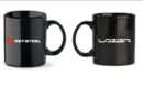 Keraaminen kahvikuppi, jossa RST-Steel ja Lazer logot.